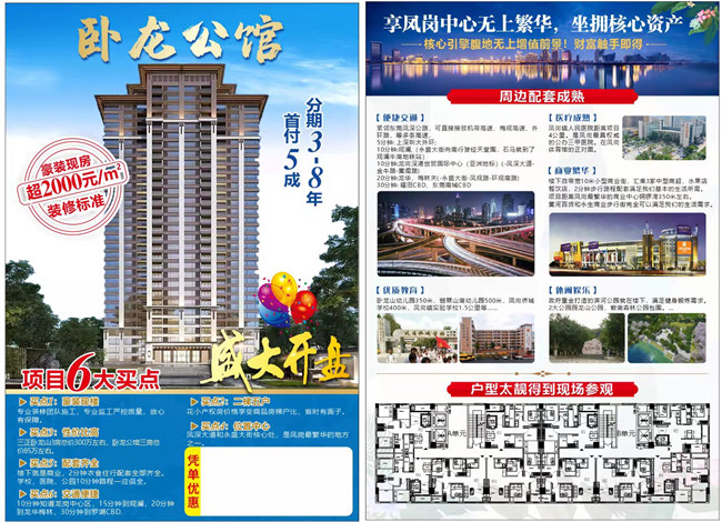 东莞凤岗镇竹塘卧龙村小产权房《卧龙公馆》,2栋规模(分别为A,B两栋),总高14层。电梯洋房(2梯5户),带精装修。收费标准:水费:4.6元/方,电费:1.02元/度,物业费:150/户。凤岗中心地段,送2000元/㎡的精装修,拎包入住,位于主道旁,周边包含沃尔玛等购物,生活非常便捷。